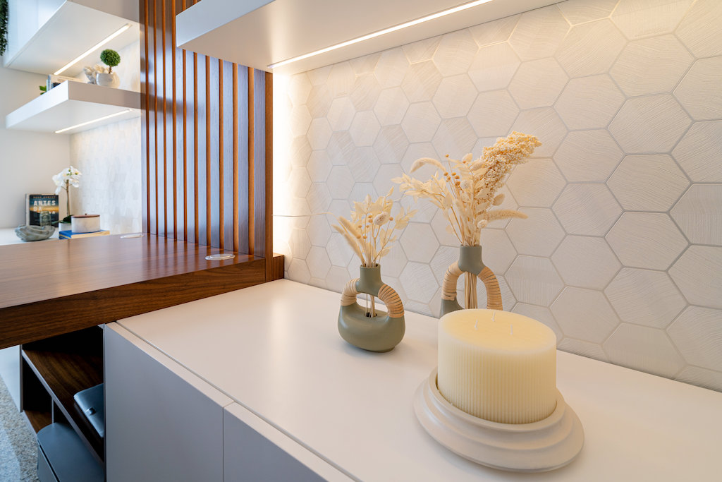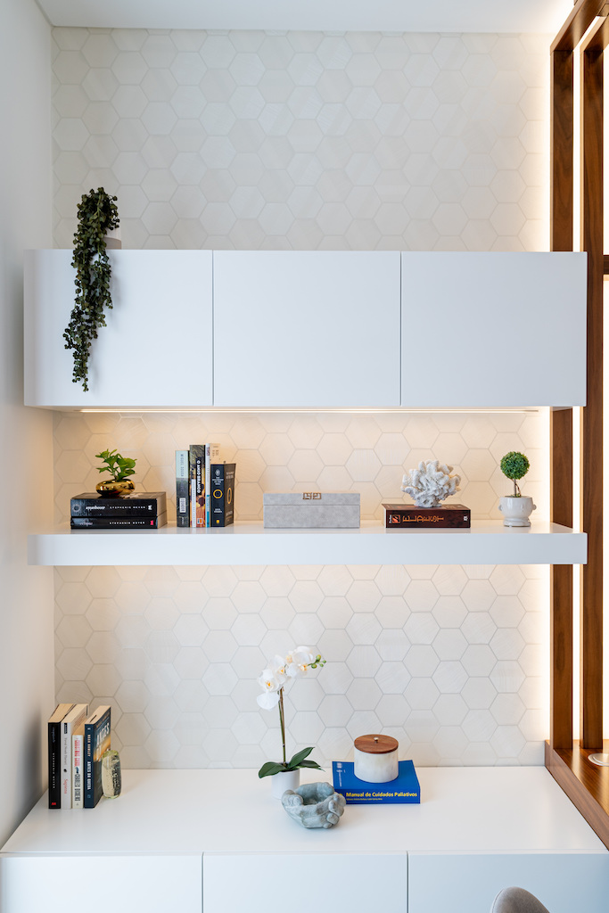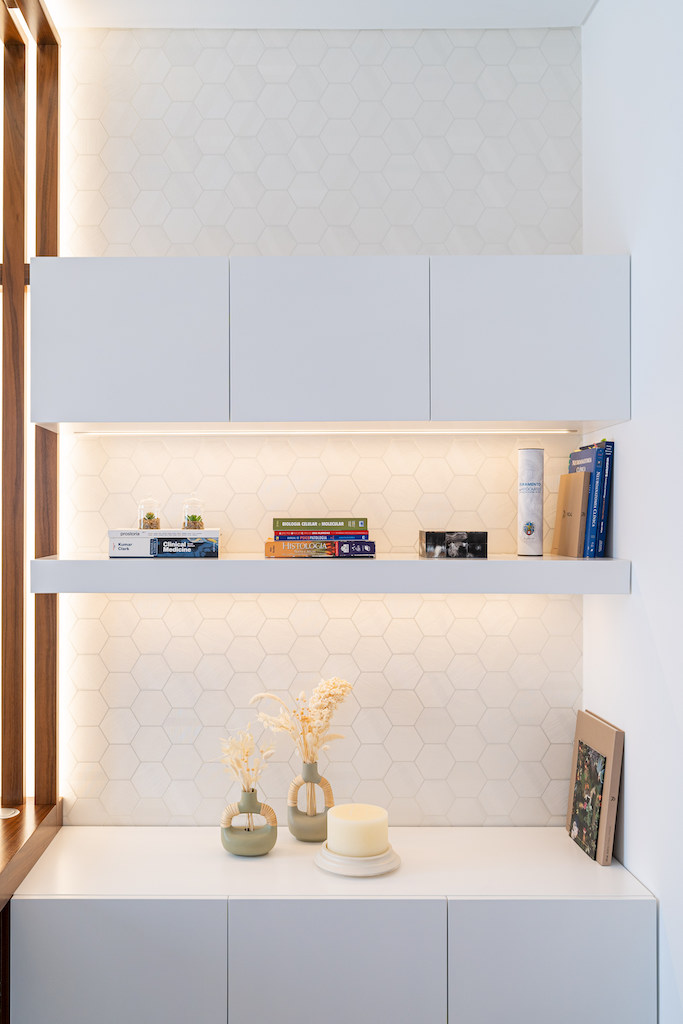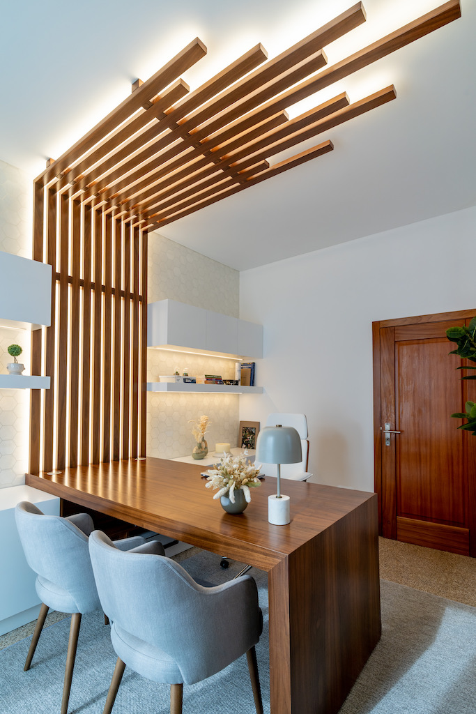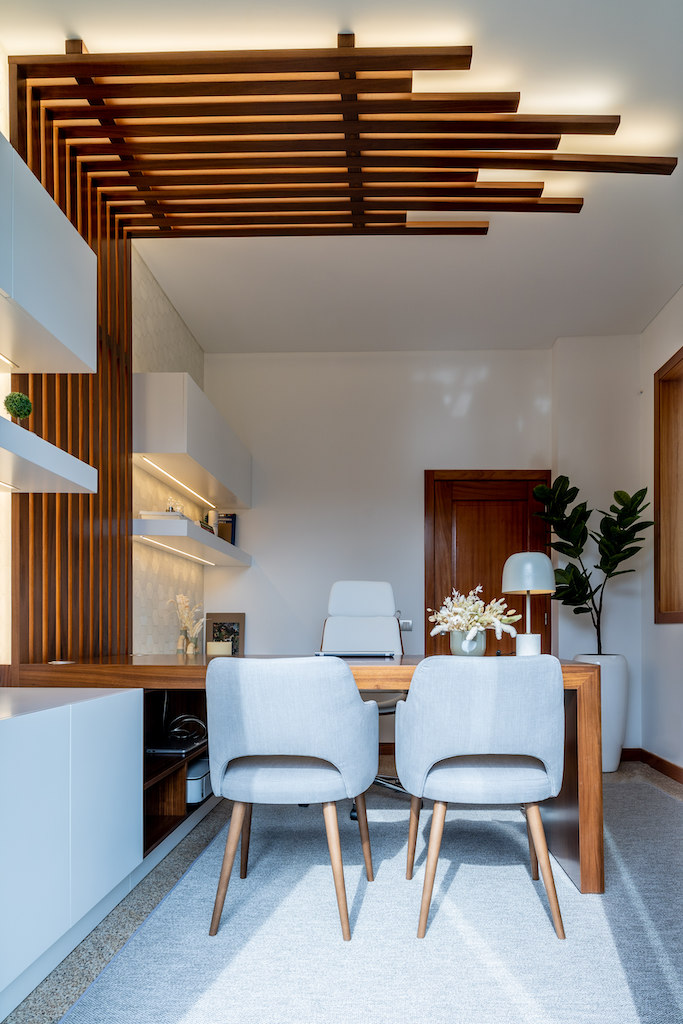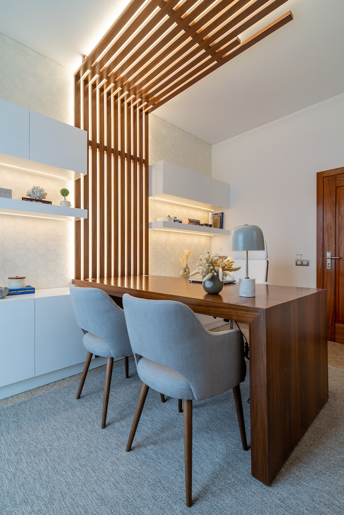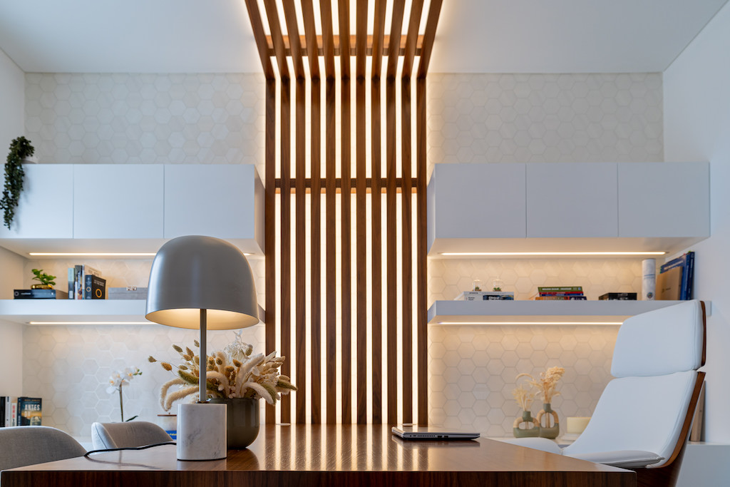 A iluminação integrada na carpintaria e todo o trabalho eléctrico ajudam que o espaço se torne mais harmonioso e acolhedor, no momento do trabalho.