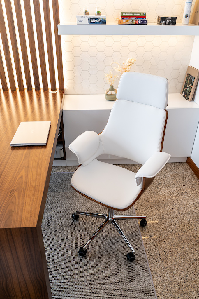 Em termos de disposição de espaço projetou-se uma secretária em folha de nogueira e optou-se por encostar à parede, de modo a criar numa das laterais espaços de circulação.